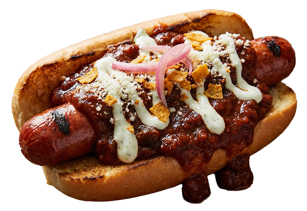 A stadium brat layered with smoky all-meat chili, controlled heat, and a cool lime sour cream drizzle that cuts the fat and lights everything up, finished with a final Dorito-crunch snap.
