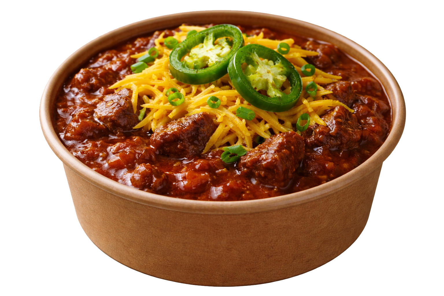 Rich, slow-braised brisket chili built the Texas way — deep, smoky, and unapologetically beef-forward. No shortcuts, no fillers, just bold flavor, balanced heat, and a slow-building richness that keeps you coming back for another bite.